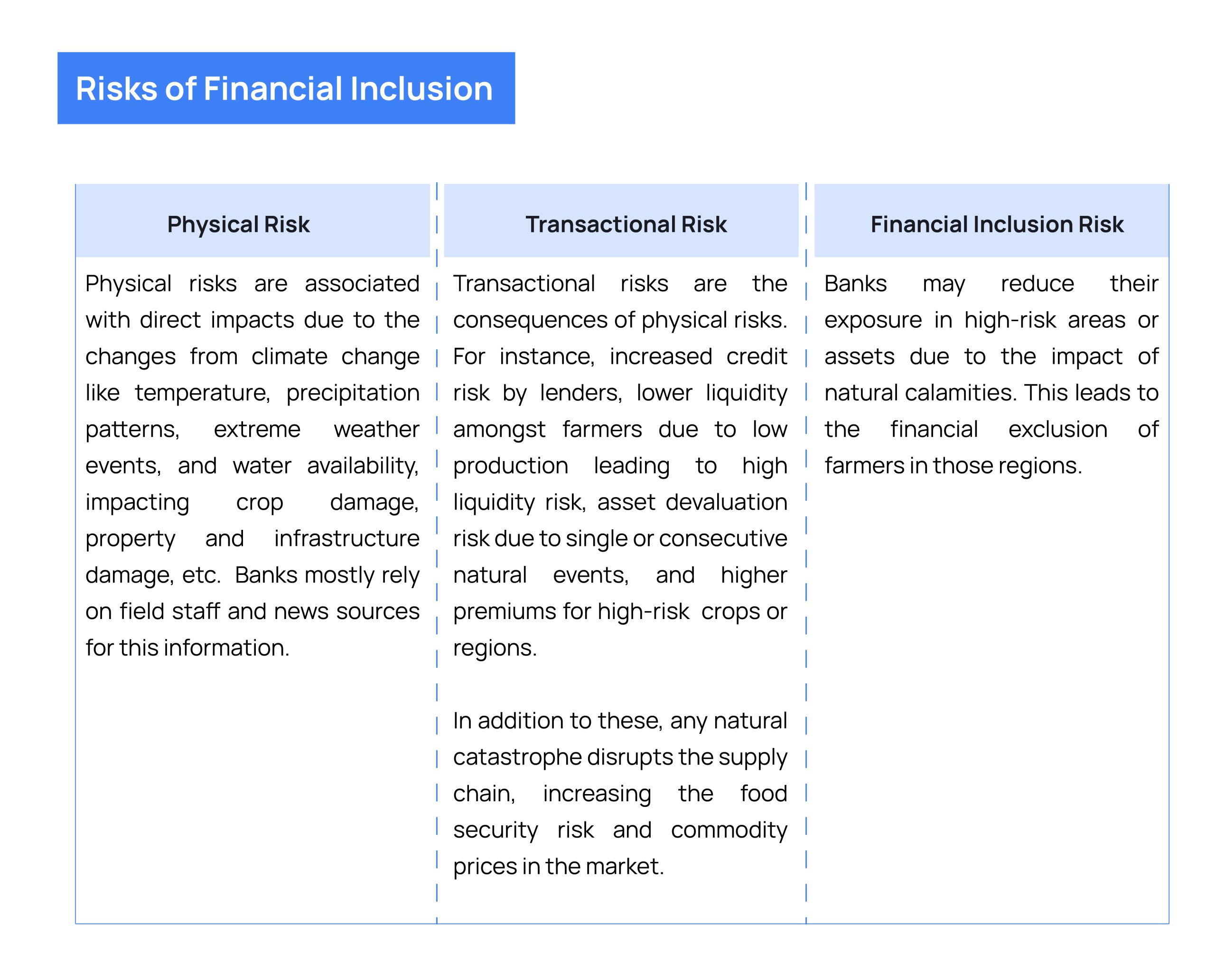 However, a combination of these is a result of the impacts of climate change. We are categorizing the risks of financial inclusion  into three buckets: