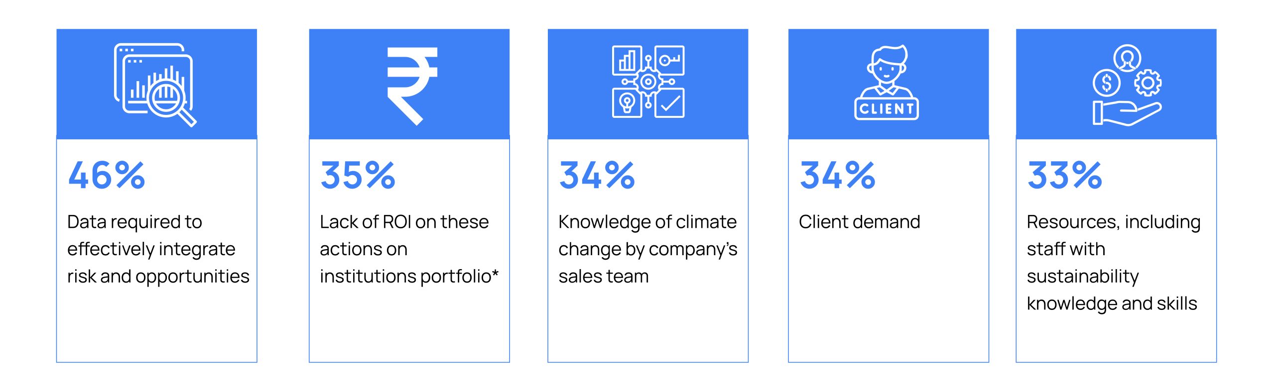 The above image highlights the top three demotivators that financial institutions perceive as limiting them to climate action initiatives. The top spot is for lack of data infrastructure which can support them in a granular, transparent, and a proactive system to gauge a risk. The second and third highlight the motivation and internal capability to build a system backed by newer technologies. In the context of agricultural lending, for instance, the extent of damage to crops cannot be measured purely on field visits due to operational challenges and scale of impact, which otherwise is easily identified using insights from earth observation data.
